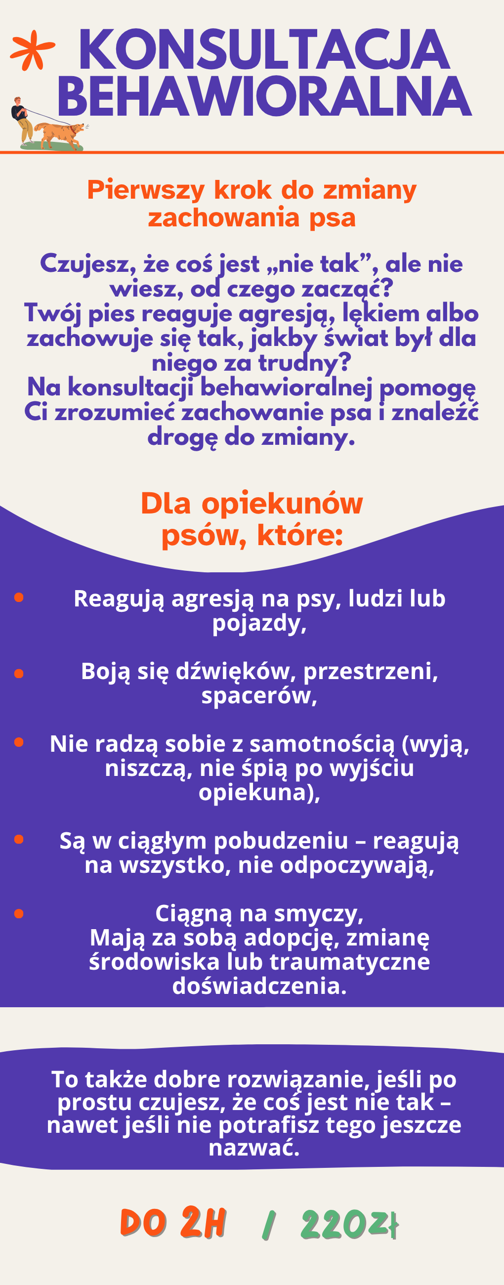 To zależy od problemu i od psa. Czasem jedna konsultacja wystarcza, żeby zrozumieć sytuację i wprowadzić kilka zmian, które od razu przynoszą ulgę. Przy bardziej złożonych trudnościach np. silna lękliwość czy agresja, ustalamy indywidualną ścieżkę wsparcia – kolejne kroki, które pomagają utrwalić zmiany i dają Ci pewność, że idziesz w dobrym kierunku.
